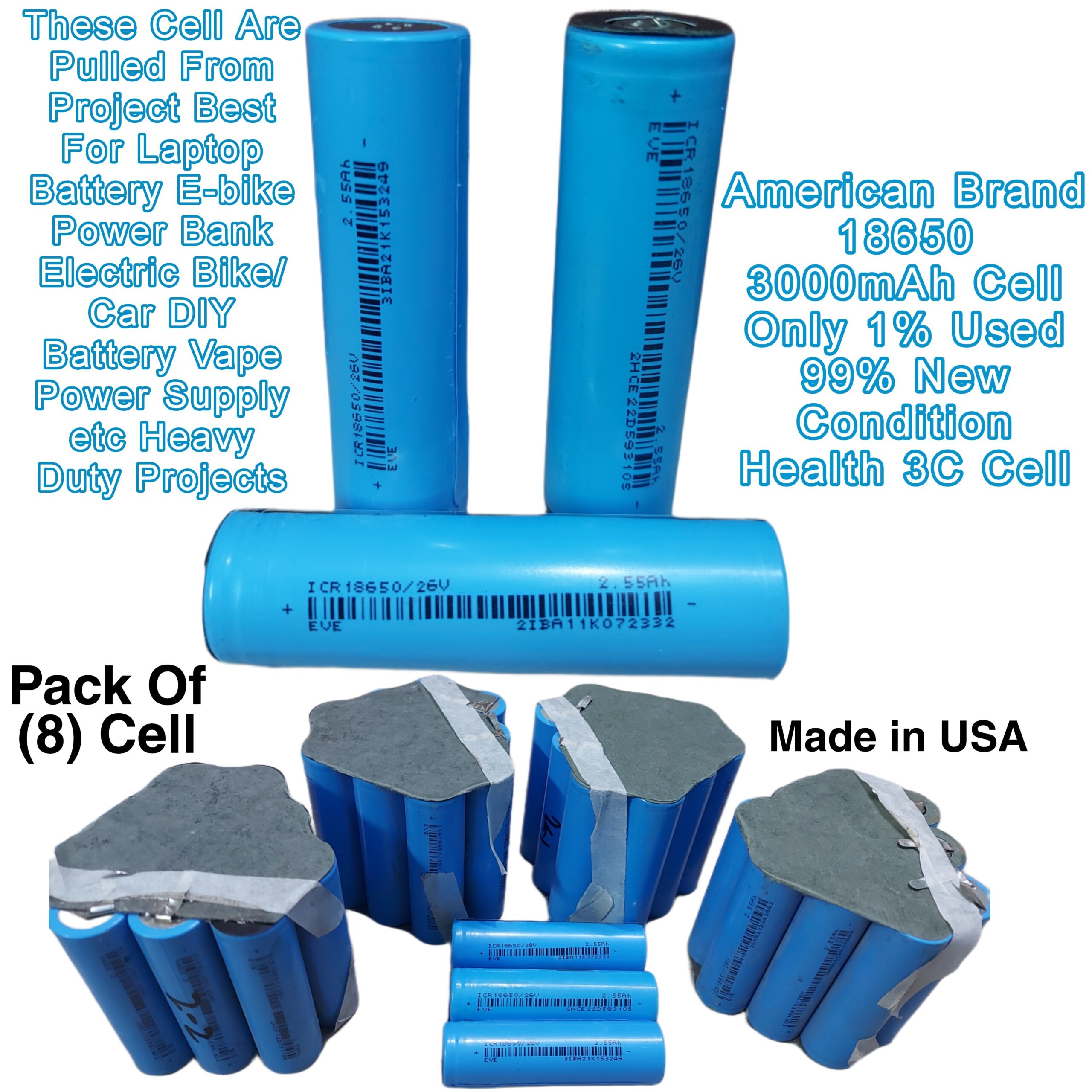 Model: 18650 Brand Canada Pack Of 8 Cell Capacity 2800mAh To 3000mAh Tested Cell Only 0.1% Used 99.99% New Condition Health 3C Cell All Cell’s Are Tested/ Standard voltage: 3.7V Diameter: approx 18mm Height: approx 65mm Applications: E-bike Power Bank, Vape, DIY Battery, Power Supply, Laptop Battery, Arduino Power Supply, Robotics, Toys, etc
